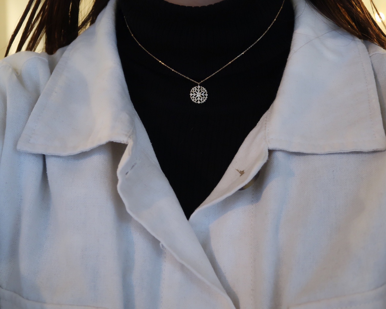こちらはピアスと同じカタチのネックレス。チェーンにもデザインが入っているので飽きにくく、フォルムもスッキリとまとまっておりとても着けやすいデザインになっています。